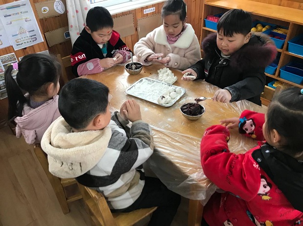 大班的哥哥姐姐搓汤圆。孩子们在老师的示范下自己动手做元宵,忙得不亦乐乎:左手捏一捏,右手捏一捏,掌心相对藏起来,跳起圆圈舞,转呀转转呀转,一只只汤圆搓好啦!一双双能干的小手做出了一颗颗甜蜜的元宵。