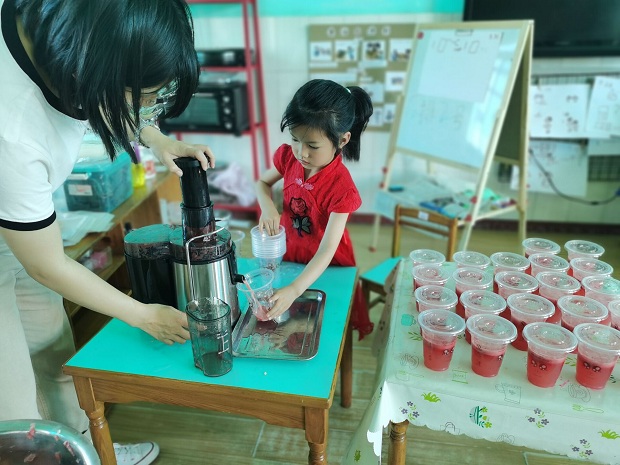 看电影怎么能少的了爆米花和饮料呢,为了孩子的健康考虑,通过调查孩子们选择喜欢的水果来制作鲜榨果汁,给爆米花进行分装,自己动手制作,感受着劳动的快乐和为大家服务的乐趣。