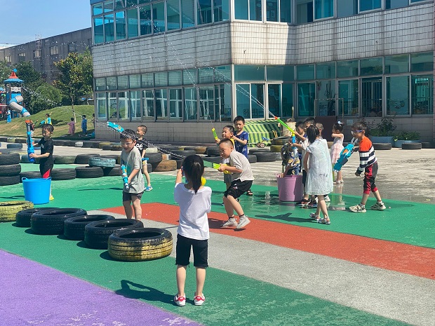 开战之前,孩子们清凉上阵,有的孩子穿泳衣,有的孩子穿凉拖,有的孩子披着雨衣保护好自己。孩子们自己动手准备好水球,灌好水。一场不分大小,不分师生的打水仗盛宴正式拉开了帷幕。孩子们欢笑地打闹着。一支支水枪“火力全开”,孩子们在操场上跑着、玩着、躲闪着,快乐无比!当一串串水柱喷射天空在音乐中开放,当每一个人身上越来越多地被来自四面八方的水柱淋湿以后,尖叫声、欢呼声、呐喊声,此起彼伏,幼儿园变成了欢乐的海洋。