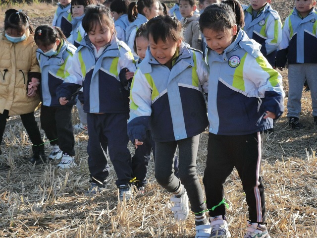 孩子们还一起进行了丰富多彩的游戏。利用田野、水渠、田埂开展了两人三足、拔河等游戏。