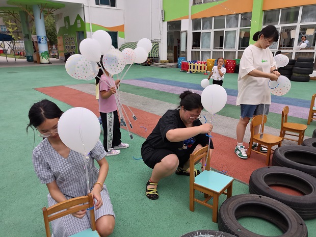 根据我们做的活动计划,我们利用下午时间,分工合作,打气球、绑彩灯,搬桌子、围场地,每一个场地都有我们忙碌的身影;每一处角落都有我们参与的痕迹,霎时间,幼儿园变得真好看啊!