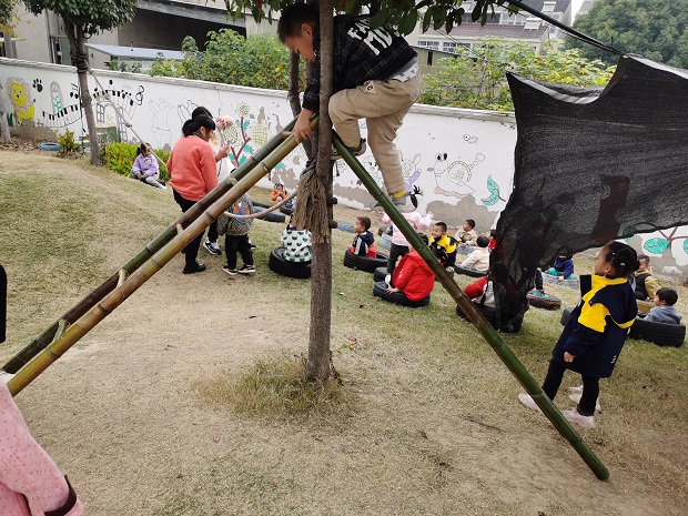 为了让孩子们有更多的体验,我们综合了各班的游戏,组织整个年级一起开展活动。梯子和麻绳组成了“穿越火线”,梯子和小树组成了“钻山洞”,溜溜布和轮胎组成了“运送带”……孩子们攀爬者,跳跃着,欢声笑语响彻了小山坡。