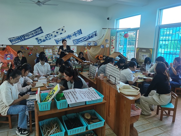 观摩结束,老师按照分组进行研讨。本次研讨主要围绕三个问题进行:(1)环境创设的价值,是否体现幼儿本位?(2)材料的提供助推了孩子哪方面的成长,是否符合年龄段?(3)根据现场环境和材料,是否有更好的建议。
