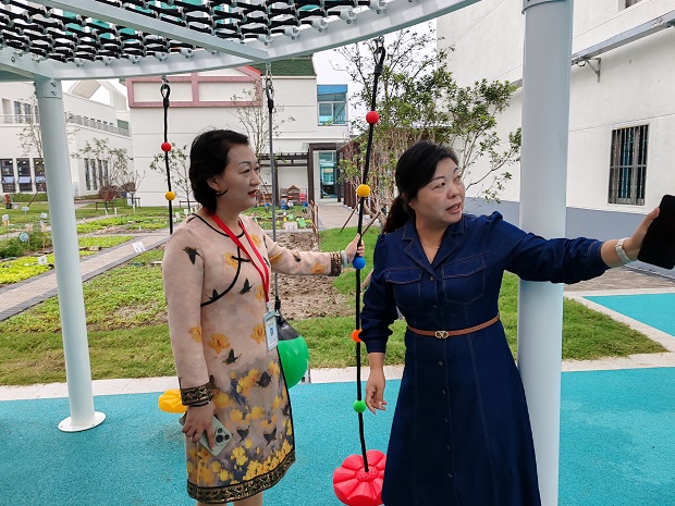 在我园领导班子的陪同下,赵园长驻足观看了大厅内公共区域的环境设置,了解了我们当下课程的开展情况,惊叹于安幼对自然资源、农村老物件的善挖掘和巧利用,对大厅环境赞叹不已。随后检查了安家幼儿园新教学楼以及户外环境,重点针对班级阅读区和种植园地进行检查指导。在指导阅读区时,赵园长针对区域设置、材料投放等给出了实质性的建议。赵园长提出,阅读区在投放规定数量的绘本时,要充分考虑当前的课程主题,同时还要结合当下孩子的兴趣等,支持幼儿的多元表征,并叮嘱我们要关注电子阅读小区域幼儿的阅读时间控制,保护幼儿视力。随后针对各班自然角和种植园地进行了指导,在肯定安幼工作扎实的同时也为我们提出了宝贵的意见和建议。最后,在张小红园长的陪同下,赵园长查看了安幼全新的户外场地,听取了张园长对各个场地功能的介绍,首肯了安幼在体育特色一块做得扎实而有效。